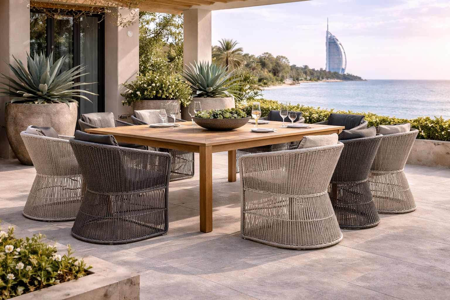 The Hayate Marina Teak Outdoor Dining Collection is designed for effortless coastal dining with a refined, contemporary feel. Featuring a solid teak dining table paired with woven rope armchairs, this collection balances natural materials with light, airy comfort—ideal for open terraces, beachfront villas, and shaded outdoor spaces.